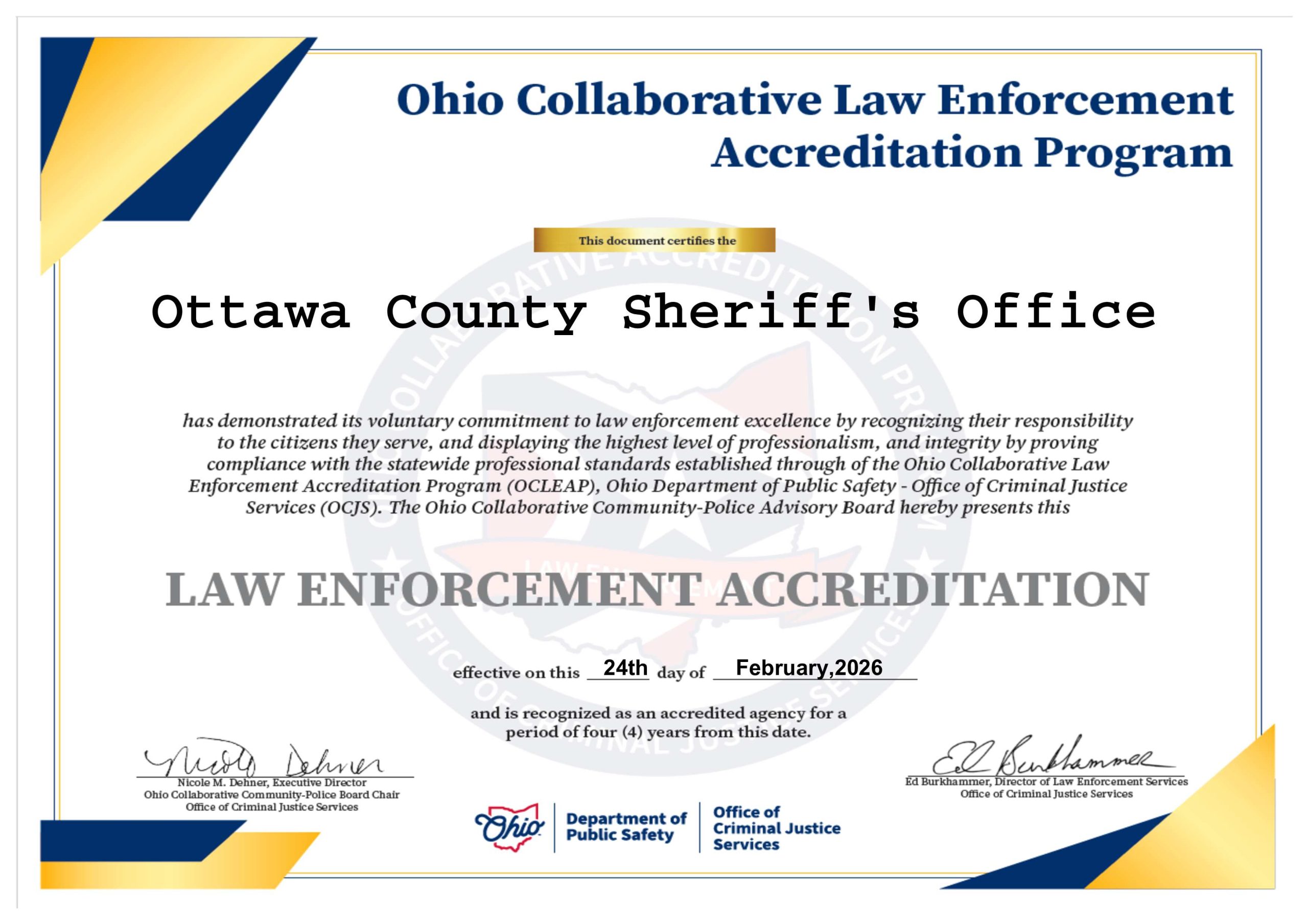 In 2026, the Ottawa County Sheriff’s Office is pleased to announce that it is one of twenty-four agencies across the state of Ohio to achieve accreditation status. Accreditation status is reviewed annually by the state of Ohio via the Office of Criminal Justice Services. Accreditation is the responsibility of Director of Training and Compliance Jeff Griffin.